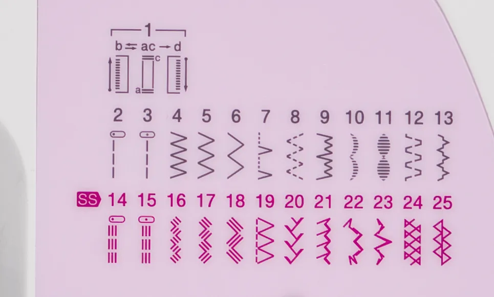 • 25 Fonctions de Couture : Explorez des points utilitaires et décoratifs sur une variété de tissus.