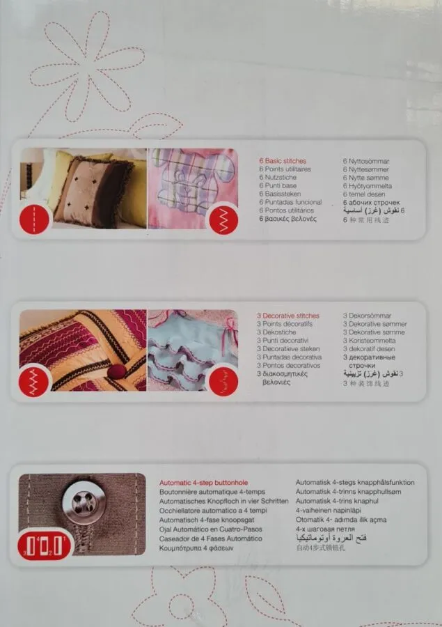 des programmes de couture pratiques avec des longueurs de point variables, une sélection de point claire et une boutonnière automatique en quatre étapes faciles. La couture devient votre plus belle tradition !