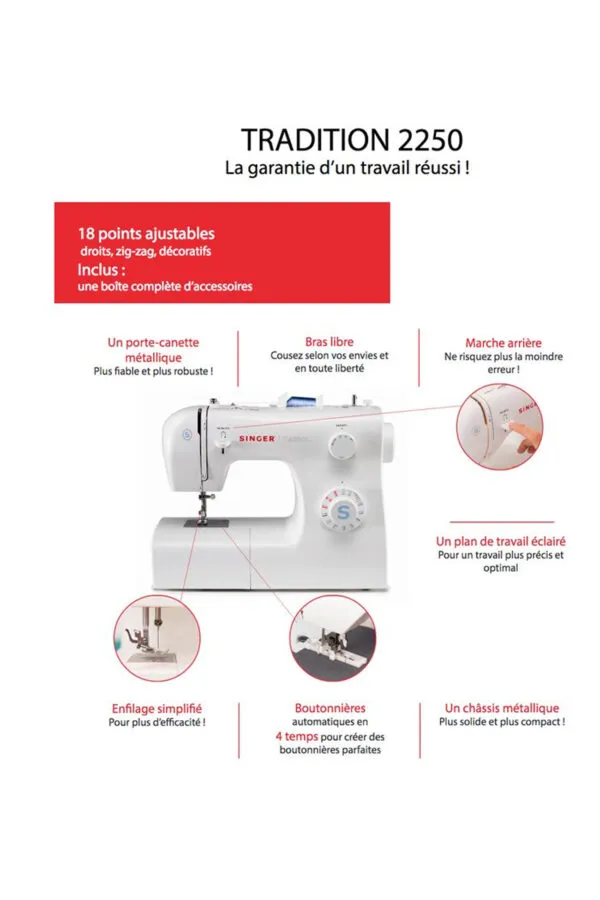 La nouvelle SINGER Tradition 2250 a tout ce qui rend la couture facile, même pour les débutants :